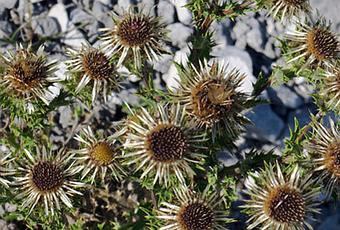 Carlina vulgaris (Carline commune) : herbacée bisannuelle ; tige dressée ramifiée ; feuilles en gouttière, embrassantes lancéolées, ondulées, épineuses ; inflorescence en capitules solitaires terminaux ; fleurs tubulaires brun-jaune, bractées extérieures foliacées, bractées intérieures coriaces blanc-jaunâtre (ne pas les confondre avec des fleurs ligulées) ; fruits surmontés d'une aigrette soyeuse. Pelouses, éboulis fixés, friches, ballast de voie ferrée