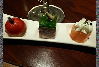 de tomate et foie gras / jambon persillé / Saumon fumé au fromage de chèvre),