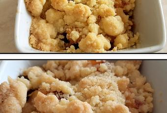 - Répartir les fruits dans les cocottes et déposer par-dessus une bonne couche de crumble.