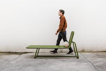 Une table et chaise longue viennent compléter la collection, sur un jeu de couleur structure et coussin. Les pièces vertes reçoivent un coussin (tissus synthétiques imperméables à l’eau) beige et inversement.