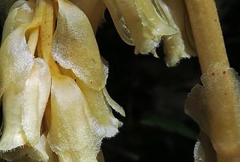 Monotropa hypopitys (Monotrope sucepin) : plante parasite blanc-jaunâtre, dépourvue de chlorophylle ; tige charnue dressée à écailles entières alternes et poils glanduleux chez la sous-espèce hypopitys (sous-espèce hypophegea glabre) ; inflorescence en grappe terminale unilatérale, d'abord courbée puis se redressant au cours de la floraison ; fleurs blanc-jaunâtre, capsules ovoïdes à 4-5 loges. Principalement sous conifères, pineraies, pessières