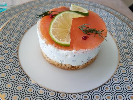 Disposez élégament un morceau de saumon fumé. Parsemez d'une goutte de citron, de sésame et d'un brin de ciboulette.