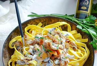 5. Le dressage : disposez les tagliatelles dans 4 assiettes creuses, versez un peu de crème sur le dessus puis ajoutez les champignons. Parsemez de persil ciselé. Servez de suite, bien chaud.