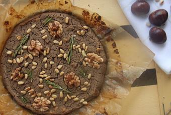 Je ne sais plus trop comment je suis tombée sur la recette du Castagnaccio. Sans doute en feuilletant l'un des innombrables magazine de cuisine, ou en me baladant sur le web culinaire... Toujours est-il que lorsque j'ai vu la recette, j'ai eu envie d'essayer. Comme j'ai la chance d'avoir ma productrice de farine de châtaigne attitrée, j'ai (presque) toujours de la farine de châtaigne chez moi, mais je manque parfois d'idée pour l'utiliser, car cela reste une farine pas forcément très simple à travailler. Du coup, je me suis dit que ce gâteau pouvait être une bonne façon de faire baisser les niveaux. Outre la part belle qu'il laisse à la farine de châtaigne, je l'avoue, ce qui m'a aussi séduit dans ce gâteau, c'est sa simplicité. Originaire de Toscane, on trouve des variantes de ce "gâteau de châtaigne" (traduction littérale de castagnaccio) en Lombardie, en Ligurie, dans le Piemont mais aussi en Corse, bref, toutes ces régions où la châtaigne était un aliment de base en réalité. Gâteau du pauvre à l'origine, puisqu'il ne contient traditionnellement ni lait, ni oeuf mais était réalisé avec les ingrédients locaux :châtaignes, huile d'olive, pignons, romarin. Aujourd'hui ces produits sont assez onéreux, mais cela vaut le coup. Je n'ai pas essayé, mais je suppose qu'on peut remplacer les pignons par des graines de tournesol, même si la saveur sera différente, ou alors mettre simplement plus de noix et moins voir pas de pignons. Ce sera sans doute moins traditionnel, mais plus abordable pour le porte monnaie.