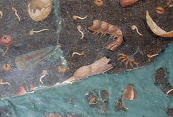 Au livre XXXVI de l’Histoire naturelle, Pline l’Ancien a décrit l’oeuvre qui avait appelé sur Sôsos, deux siècles plus tôt, une gloire qui fut universelle dans le monde antique : « Dans le genre de la mosaïque Sôsos fut l’artiste le plus célèbre. Il fit à Pergame ce que les Grecs ont appelé une chambre non balayée. » Mot à mot, en grec, une « sale maison ». On donna ce nom grec - asarôtos oikos - à cette oeuvre parce que Sôsos avait représenté à l’aide de petits cubes peints de couleurs de toutes sortes les reliefs d’un repas comme si on avait laissé les déchets d’un festin traîner par terre après qu’on avait mangé.
