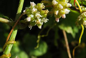 Cuscuta europaea (Cuscute d'Europe) : herbacée parasite sans feuilles, s'enroulant autour de la plante parasitée (principalement des herbacées : Urtica, Humulus, Artemisia...) à laquelle elle se fixe par des suçoirs ; tiges vertes ou rougeâtres ; fleurs blanches à rosées en glomérules, étamines ne dépassant pas la corolle, 2 styles plus courts que l'ovaire. Habitat de l'espèce parasitée, principalement berges des cours d'eau.