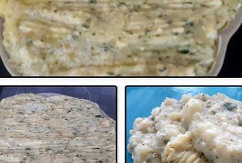 9- Mettre la préparation dans un plat à gratin préalablement huilé, lisser la surface, éparpiller des petits bouts de beurre.