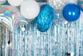 10H30 Je gonfle quelques ballons helium en forme de flocon de neige que je leste avec des poids pour créer un semblant de forêt bleue et j’installe une belle suspension etoile papier et autres rosaces en papier iridescent pour un effet remarquable !