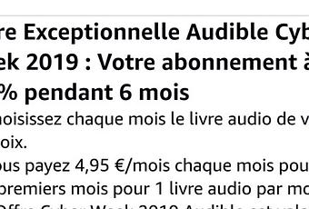 Amazon propose une réduction de 50 % sur son abonnement Audible. Soit 5 € au lieu de 10 € par mois (j'ai arrondi).
