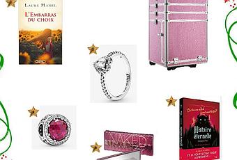 1. Livre L'Embarras du choix de Laure Manel 2. Valise d’esthétique (La mienne deviens beaucoup trop petite)3. Bague Pandora4. Charms Pandora - La belle et la Bête 5. Livre l'Histoire Éternelle6.Pallette Naked Cherry
