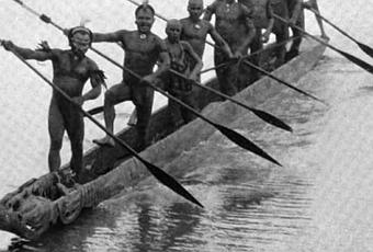 Mais c’est un mannequin grandeur nature en tissu d'écorce attaché à des cadres en bois qui retient son attention. Il représente une silhouette féminine équipée d'une jupe faite de fibres, dotée d’une tête énorme et ridicule avec des cheveux frisés et un nez creux. L’un des hommes enfile le masque et effectue une courte danse au cours de laquelle il imite une femme en chantant d'une voix aiguë en se balançant d'avant en arrière. Les maisons aussi sont différentes de ce qu’ils ont vu jusqu’à présent : elles sont installées sur des piliers et l'avant du pignon possède des ouvertures qui permettent de représenter une paire d'yeux, un nez et une bouche “souriante”.