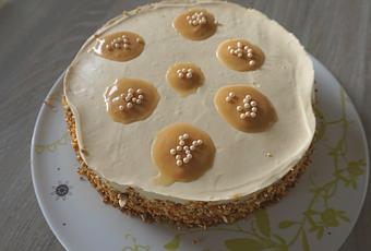 Au moment de servir, déposer la confiture de lait réservée dans les petits cercles dessinés sur le dessus du gâteau.