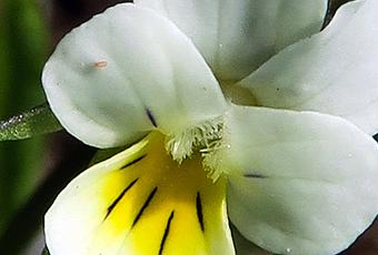 Viola arvensis (Pensée des champs) : herbacée à tige ; feuilles alternes, stipules digitées à lobe médian foliacé ovale-lancéolé ; fleur à symétrie bilatérale, calice à 5 sépales libres, corolle à 5 pétales libres, pétales latéraux et supérieurs blancs plus ou moins tachés de violet, pétale inférieur taché de jaune, prolongé par un éperon nectarifère, capsule renfermant plusieurs graines. Espèce messicole : champs, cultures, friches, ballast de voie ferrée