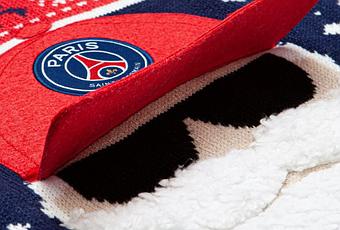 Cette saison, le Paris Saint-Germain propose un pull à imprimé bleu, blanc et rouge, réalisé en 100% acrylique, sur lequel on retrouve le père Noël en fervent supporter du club.