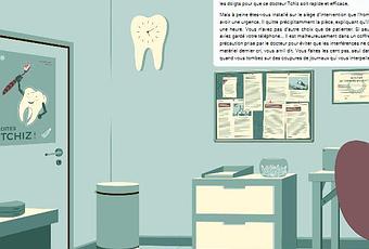 Vous venez d’emménager dans une nouvelle ville. Vous avez une rage de dents et vous rendez chez votre dentiste. Quand celui-ci disparait, vous comprenez vite qu’il ne faut pas rester dans son fauteuil bouche grande ouverte…. Vous allez donc avoir les instructions de jeu sur la première page. Vous lisez ensuite la page d’introduction vous plantant le décor et c’est à vous de jouer. Résolvez les énigmes et trouvez l’échappatoire de ce terrible danger qui vous observe….