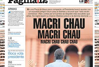 Ce matin, dans la presse, on ne trouve que fort peu de photos, pour ne pas dire aucune, montrant la place dans son ensemble : on voit une foule importante mais pas assez nombreuse pour que la circulation automobile ait été complètement interrompue (on note en particulier sur le côté sud des véhicules au milieu de la chaussée vide). La foule occupe le début de avenida de Mayo, ce qui n’était pas le cas en août, lorsque le camp politique de la droite néolibérale a tenté de se dénombrer sans grand succès. La presse montre aussi que le président a été porté en triomphe par quelques partisans proches du podium. Página/12 insiste sur le peu de succès rencontré par la cérémonie où on a poussé à fond le volume de la musique peut-être pour cacher la frilosité des applaudissements et des vivats et de fait, la bande son des vidéos est saturée par la musique et on n’entend pas le public qui réagit pourtant autour de Macri. Les autres titres cherchent à montrer ou à démontrer le contraire.