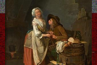 La jeune fille allait souper quand l’officier est arrivé à l’improviste (cape sur la miche). Ils ont vidé la carafe en buvant dans le même verre et joué de la musique, la jeune guitariste s’asseyant sur les genoux du claveciniste (pas de chaise visible). Mais un jeune messager a interrompu le concert, probablement pour annoncer l’arrivée d’un autre visiteur. Tout en l’empêchant de voir celui qui est déjà dans la pièce, elle lui donne un billet décommandant l’importun.