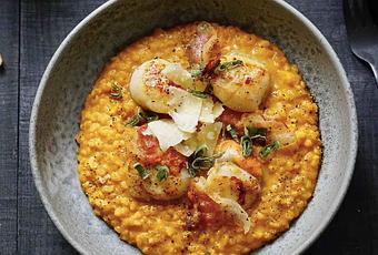 Si vous aimez mangé une dinde à Noël, je ne suis pas certaine que vous trouviez la recette de vos rêves chez moi !! Par contre si vous aimez mangé autre chose que des plats traditionnels alors oui là je peux vous aider .... Dans ce 2 eme menu je vous propose un risotto fait avec du petit épeautre et cuit dans un bouillon à la courge butternut, cela permet de bien parfumé la préparation. J'aime beaucoup associé les coquilles St Jacques avec ce risotto et le lard . Je vous en parle souvent du lard de ganciale , celui qui sert à préparer les pâtes à la carbonara . Il n'a pas du tout le même goût qu'un lard classique , il est assez salé , et plus parfumé . Il vient des joues du cochon . Vous le trouvez chez le traiteur italien .