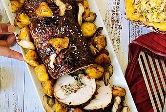 L’article Rôti de dinde laqué à la sauce soja farci au riz complet aux légumes asiatiques accompagné d’ananas Victoria rôti, de champignons Shiitaké et d’un riz complet frit. est apparu en premier sur L'atelier de Kristel.