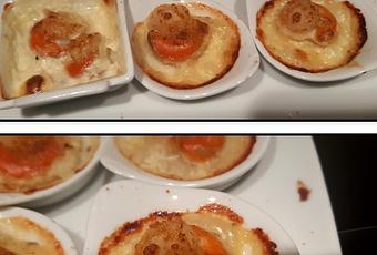 1- Déposer dans une cassolette 2 noix de Saint-Jacques, puis mettre la crème, et saupoudrer de curry.