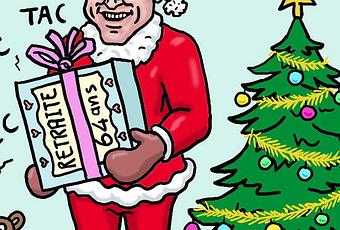 Petit Papa Noël, quand tu descendras du ciel, apporte nous des cadeaux par milliers ! Et bien, si c'est Macron le Père Noël, il nous apporte un seul cadeau, mais il est de taille : c'est sa réforme des retraites !!! C'est un beau cadeau pour ceux qui aiment bien bosser. Ils pourront ainsi travailler plus longtemps ! C'est super !!!