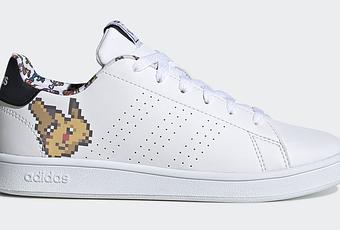 Mais les images montrent la silhouette blanche classique d'Adidas advantage avec une mise à niveau nostalgique grâce à l'ajout d'un Pikachu 8 bits qui orne le talon latéral. Ainsi, le Pokémon pixélisé apparaît avec sa célèbre fourrure jaune et ses joues rouges. La tige en cuir reste en blanc, avec des perforations minimalistes soulignant les trois rayures.