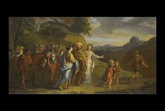 - côté positif : Coriolan accueille sa mère Verturia (debout dans l’ombre) et son épouse, Volumnia (lui présentant son propre fils) ;