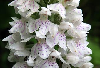Dactylorhiza fuchsii (Orchis de Fuchs) : tige pleine ; feuilles généralement maculées, l'inférieure courte, à plus grande largeur dans sa moitié supérieure, les intermédiaires lancéolées, les supérieures bractéiformes ; inflorescence dense, conique puis cylindrique ; fleurs blanches à roses, sépales latéraux dressés, sépale dorsal en casque lâche avec les pétales, labelle nettement trilobé, orné de taches et lignes roses, lobes latéraux arrondis, lobe médian plus long et souvent plus large que les latéraux, éperon grêle de la taille de l'ovaire. Pleine lumière à mi-ombre, sols calcaires secs à détrempés, prairies humides, lisières forestières...