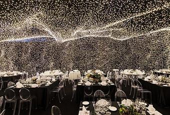 Pour ce faire, ils ont décoré les murs et le plafond ondulés avec plus de 250 000 LED. Cette abondance de lumières plonge les convives dans un ciel étoilé scintillant en contraste avec l'intérieur noir. Les tables en miroir mettent également l'accent sur l'expérience. Ils permettent aux invités de voir les reflets des milliers de lumières pendant qu'ils mangent.