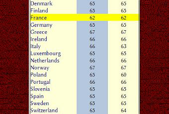 Si vous comparez l'âge de la retraite en France sur la table ci-jointe avec celui d'autres pays, vous pouvez voir que mes compatriotes peuvent arrêter de travailler bien plus tôt que dans la plupart des autres nations européennes et nord-américaines.