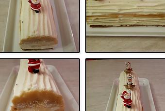 1- Démouler la bûche (en passant les bords une seconde sous l’eau chaude, ça se démoule tout seul), retirer le rhodoïd très délicatement et couper les extrémités bien nettes pour laisser apparaître l’insert.