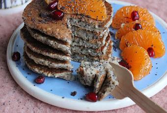 Personnellement, je suis plutôt salé au petit déjeuner, alors je me prépare ce genre de pancakes plutôt pour le goûter, mais on va pas chipoter... Pour une fois je trouve que la promesse "sain et rapide" est plutôt respectée. La préparation prend vraiment 5 minutes (le temps d'éplucher la banane, de mesurer les ingrédients et de tout fourrer dans le mixer), les ingrédients sont abordables au commun des mortels (j'ai choisi de rajouter des graines de chia pour écouler mon stock, mais à mon avis on peut très bien s'en passer) et le résultat est au rendez-vous. Certes, on va pas se mentir, cela ne ressemble pas à des pancakes classique, le goût de banane est assez présent, mais ces petites crêpes sont tout de même délicieuses et forment un petit-déjeuner ou un en-cas à la fois nourrissant et gourmand (surtout si on les tartine ensuite de purée d'amande ou qu'on les arrose d'un coulis de fruits ou de sauce au pavot :)). Comme je ne suis pas un bec sucré, je n'ai pas ajouté de sucre à la pâte, car entre la banane et la vanille, je la trouve assez sucrée comme ça, surtout si on veut les déguster avec un peu de confiture, de pâte à tartiner maison ou, de façon plus "traditionnelle", arrosés de sirop d'érable. J'ai choisi d'y incorporer ici des graines de pavot, qui apportent croquant agréable, mais là encore, libre à vous de les ajouter ou pas : c'est au final une recette très adaptable, comme je les aime !