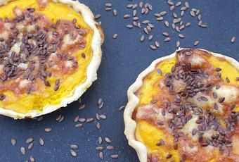 Étaler la pâte brisée, foncer les moules à tartelettes avec les morceaux de pâte emporte-piécés. Garnir avec la préparation de potiron. Garnir du fromage râpé et de graines de lin. Enfourner jusqu’à ce que les tartelettes soit un peu dorées et que la pâte soit bien cuite.