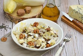 Directement dans les assiettes ou un saladier, mélanger les lentilles, les endives, les morceaux de fromage et les noisettes.