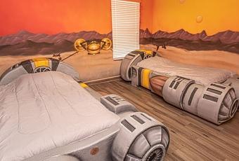 La villa se trouve à 15 minutes à peine en voiture du parc Walt Disney World. Pas sur cependant que vous souhaitiez la quitter tant elle semble être une véritable attraction en soi. La villa comporte 9 chambres dont chacune est un petit chef-d'œuvre. Le design de chacune est inspiré d'une des planètes de l'univers Star Wars. Les peintures sont faites à la main, les planètes sont faites sur mesure en 3D, les détails de la franchise sont minutieusement respectés.