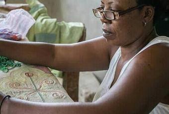 Myrlande Constant est une artiste haïtienne et autodidacte, formée par sa mère mais aussi dans le cadre de son emploi dans une entreprise de broderie de robes de mariée. Elle n’utilise donc pas la technique des ateliers de fabrication de drapo vaudou. Elle ne coud pas de paillettes mais pratique le perlage, c’est-à-dire qu’elle fixe de petites perles rondes préalablement enfilées, au moyen d’un crochet. Comme elle travaille le revers de l’œuvre, elle ne voit pas directement l’image se construire.