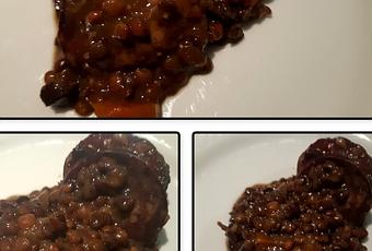 3- Ajouter les lentilles, l’eau, le vin, les feuilles de laurier, la moutarde, le cube de bouillon et la saucisse de Morteau coupé en gros morceau.