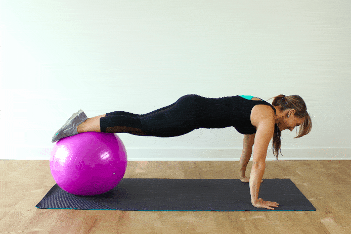 Agenouillez-vous derrière votre ballon de gym et posez votre estomac dessus. Avancez vos mains vers l’avant jusqu’à ce que vous vous trouviez dans une position de planche avec la balle sous vos tibias et vos épaules directement au-dessus de vos mains. Baissez-vous et faites une pompe. Répétez 15 à 20 fois.