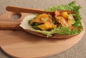 -1 mangue -1 ou 2 avocats selon la taille -1 fruit de la pasion -100 g de saumon fumé -1 cébette -1 cc de sauce de soja -1,5 cs d'huile de sésame -1 cs de vinaigre de riz -1 cc de gingembre frais râpéEplucher et couper en morceaux la mangue et les avocats. Disposer dessus le saumon fumé coupé.