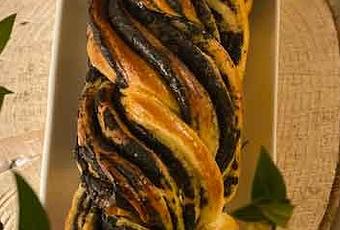 - Tresser le boudin tranché en gardant l'intérieur de la babka garnie sur le dessus, donc bien visible, et en rabattant les extrémités en les plaçant vers le bas et sous la tresse