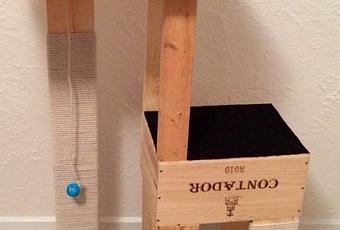 Ensuite, vous pouvez compléter en enroulant de corde, un des piliers de bois. Sur la corde, votre chat pourra aiguiser ses griffes comme il le voudra. Pensez à ajouter un petit jouet avec un élastique; des heures de plaisir en perspective pour votre félin.