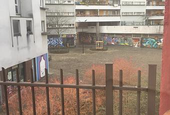 Des fenêtres à l'étage de la Galerie Jean Collet font entrer la lumière extérieure dans l'espace d'exposition. Elles donnent aussi une ouverture sur le quartier, sur l'avenue Guy Moquet, la place qui jouxte la Galerie et un peu plus loin. Voici quelques images.