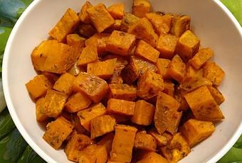 بطاطا حلوة مشوية في الفرنالمكونات:حبتان كبيرتان من البطاطا الحلوة (حوالي 750 غرام) ، مقشرة ومقطعة الى مربعاتملعقتان كبيرتان من زيت زيتون3/4 ملعقة صغيرة من الملح ربع ملعقة صغيرة من الفلفل الأسودنصف ملعقة صغيرة من مسحوق الفلفل الحار نصف ملعقة صغيرة من الفلفل الحلونصف ملعقة صغيرة من بذور الكموننصف ملعقة صغيرة من الزعتر المجففبياض بيضةطريقة التحضير:1- يسخن الفرن على حرارة 370 درجة فهرنهايت.2- في وعاء صغير تخلط البهارات وزيت الزيتون وبياض البيض.يضاف هذا الخليط إلى البطاطا الحلوة و يتم تغطية البطاطا الحلوة بخليط البهارات.3- تصف البطاطا الحلوة فوق صحيفة بيسكوى مغطاة بورق الزبدة.4- تشوى البطاطا الحلوة في الفرن لمدة 15 دقيقة. تخرج البطاطا من الفرن و بواسطة ملعقة يتم قلبها فوق الصفيحة و تدخل مرة اخرى للفرن لتشوى لمدة 20 دقيقة اضافية.