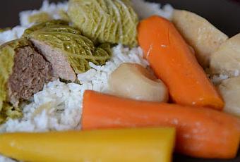 On peut servir les légumes et le chou farci avec du riz nature en l'arrosant avec le bouillon.