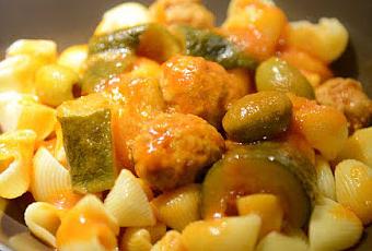 Emincer l'oignon Utiliser un faitout/une casserole avec couvercle Faire revenir l'oignon dans un filet d'huile d'olive sur feu moyen jusqu'à ce qu'il devienne translucide. Ajouter la purée de tomate Rincer le contenant avec de l'eau puis l'ajouter (l'eau pas le contenant) pour délayer la sauce Ajouter le sel et le poivre Ajouter les courgettes coupées en gros morceaux Ajouter les olives Faire des boulettes avec la chaire à saucisse Les déposer délicatement dans la sauce Recouvrir et laisser mijoter l'ensemble pendant une heure.