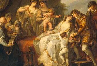 Coriolan auquel sa mère et se femme présentent son enfant (Shakespeare, Coriolan, Acte 5) gravure de 1785.
