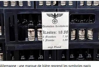 … je suis donc allé voir l’article en question, malgré ma répugnance personnelle pour Le Point. Cette bière qui reprend à la fois l’écriture et la symbolique nazie ( écriture gothique, aigle aux ailes déployées, étiquette de couleur brune) a été commercialisée par la marque German Reich Brewery sous le nom de « Deutsches Reichsbrau ». Ele a été mise en vente vendredi à Bad Bibra, une ville située dans le Land de Saxe-Anhalt, dans un magasin de la chaîne Getränke-Quelle.