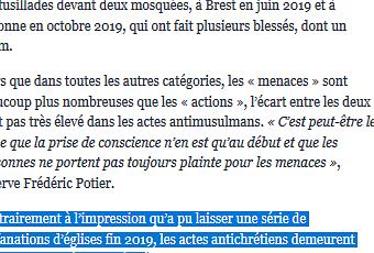 Voilà une comptabilité que je trouve pour ma part intéressante bien qu’affligeante, et de nature à répondre rationnellement aux obsessions des bas du front qui tentent invariablement d’instrumentaliser un racisme pour en justifier un autre… Il suffit en effet d’entendre ou de voir un individu quel qu’il soit brandir l’excuse du « racisme anti-blanc » ou de la soi-disant montée en flèche d’actes anti-chrétiens (jusqu’à sombrer dans le complotisme le plus grossier à l’occasion de l’incendie de Notre Dame) pour avoir aussitôt une idée du champ d’appartenance idéologique de celui ou de celle qui brandit ce genre de billevesées identitaires…