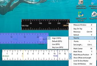 Pour ajouter des marqueurs, modifier l'opacité ou l'orientation de la règle, mesurer une fenêtre ou marquer le centre de la règle, cliquez dessus avec le bouton droit. Vous verrez alors un menu avec les différentes options du programme, permettant de personnaliser l'outil. Une règle peut être redimensionnée à main levée ; pour cela, faites simplement glisser l'un des bords vers l'intérieur ou vers l'extérieur.