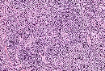 Maladie de Castleman. Micrographie à agrandissement moyen d'une hyperplasie d'un ganglion lymphatique angiofolliculaire.